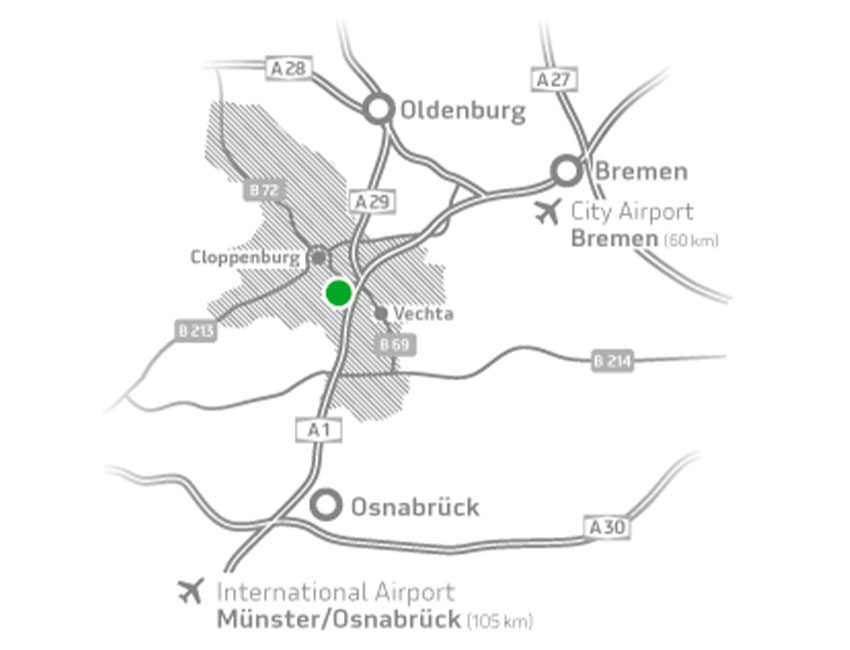 Außerdem sorgt die geografische Nähe zu Oldenburg, Bremen, Osnabrück sowie zu Hamburg und Münster dafür, dass die Absatz- und Beschaffungsmärkte „vor der Haustür“ liegen.